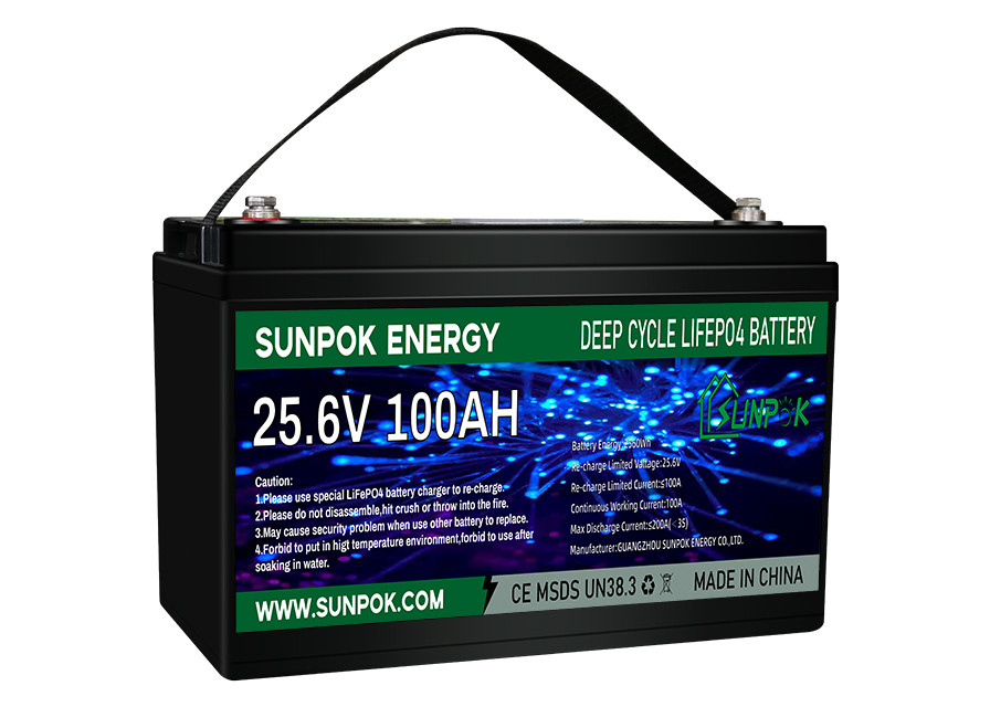 Το Sunpok 12 βαθιά μπαταρία κύκλων φωσφορικού άλατος σιδήρου λίθιου βολτ βολτ 24V υιοθετεί τη διεθνή κύρια τεχνολογία ενότητας κυττάρων, η οποία μπορεί να επιτύχει 100% DOD (βάθος της απαλλαγής), και η μπαταρία είναι εξοπλισμένη με μια ενότητα Bluetooth, που μπορεί μακρινά να ελέγξει τις εσωτερικές λεπτομέρειες της μπαταρίας μέσω των κινητών τηλεφώνων οποτεδήποτε, οπουδήποτε.