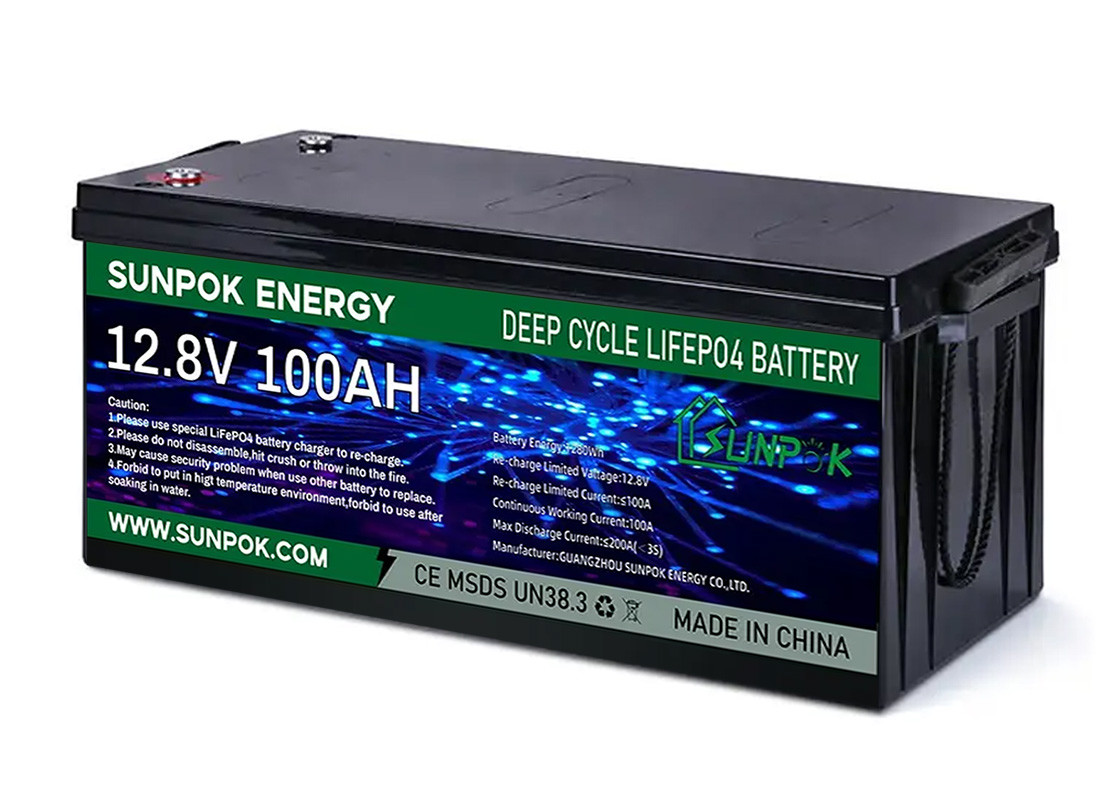 Το Sunpok 12 βαθιά μπαταρία κύκλων φωσφορικού άλατος σιδήρου λίθιου βολτ βολτ 24V υιοθετεί τη διεθνή κύρια τεχνολογία ενότητας κυττάρων, η οποία μπορεί να επιτύχει 100% DOD (βάθος της απαλλαγής), και η μπαταρία είναι εξοπλισμένη με μια ενότητα Bluetooth, που μπορεί μακρινά να ελέγξει τις εσωτερικές λεπτομέρειες της μπαταρίας μέσω των κινητών τηλεφώνων οποτεδήποτε, οπουδήποτε.